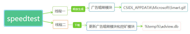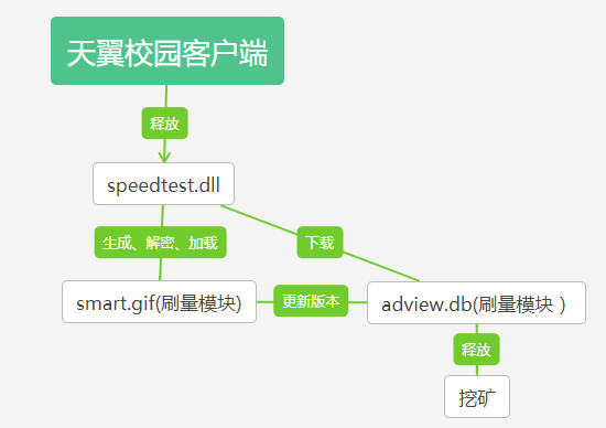 天翼校园客户端安装后,安装目录中会释放speedtest.dll文件,speedtest.dll扮演病毒“母体”角色。执行下载、释放其他病毒模块,最终完成刷广告流量和实现挖矿。