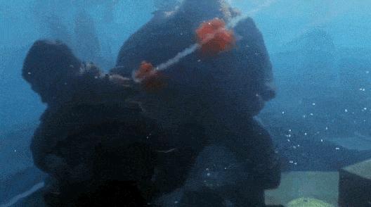 开头镜头里有子弹射入海水中,能看到子弹在海水里划出一道道弹痕,钻入人体,绽放出朵朵的血花。很残酷,很血腥,给人强烈的感官刺激,实际上这不符合现实。