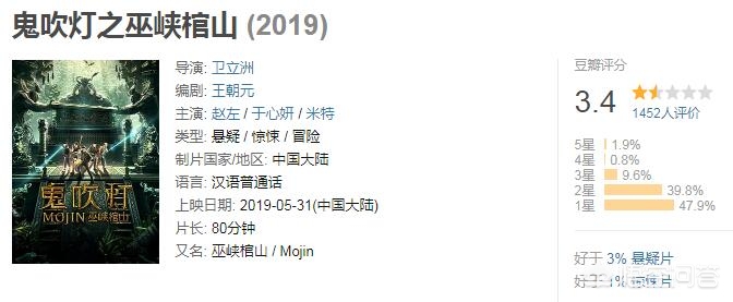 其次从观众评价来看。《云南虫谷》豆瓣评分只有3.2分,而《鬼吹灯之巫峡棺山》只有3.4分,这样的评价算是差评。可想而知并没有得到大多数观众的认可。