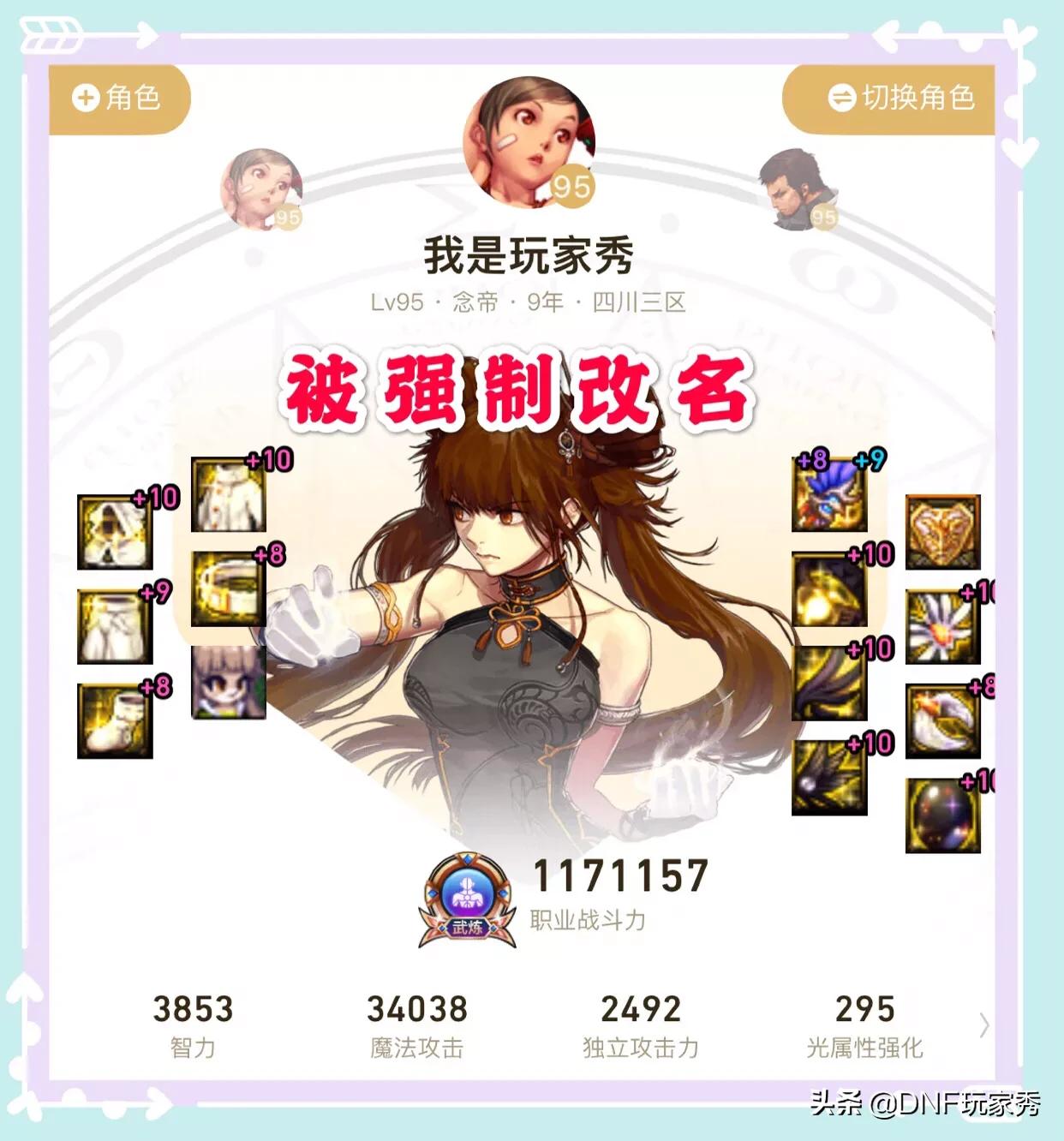 在2019年5月的一次强制改名中,秀儿的账号“DNF玩家秀”被判违禁,据说是因为含有“DNF”字样,无奈之下,秀儿把角色改名为“我是玩家秀”,虽然白嫖了改名卡,但是内心是不开心的!