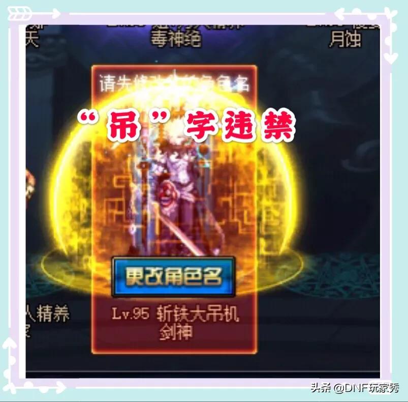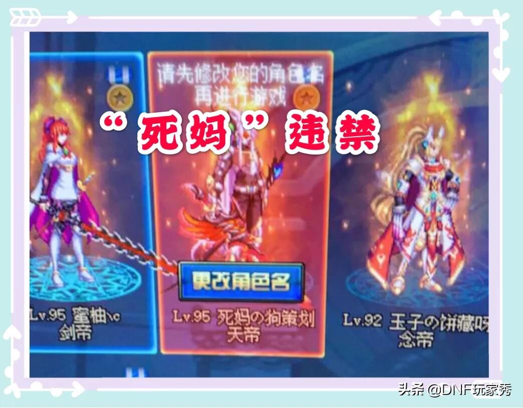 DNF游戏每隔一段时间,就会来一波“强制改名”,系统会筛选出那些账号中有“违禁”字的角色,然后,发出“强制改名”通牒,要求玩家在规定时间内必须改名,否则这个角色就会被删除。