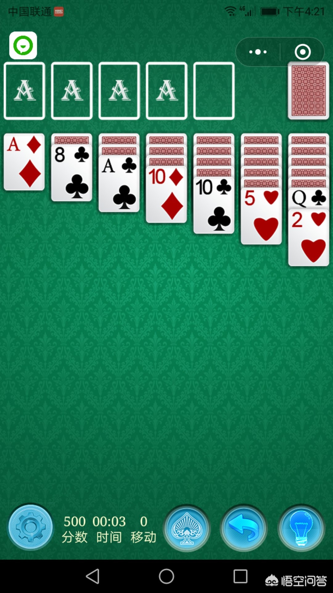微信搜索“纸牌接龙经典”,休闲小游戏,极精致的纸牌接龙!流畅的操作!任意使用的提示功能!随时反悔之前的移动!智能移牌功能想您所想!巨量关卡供您选择!