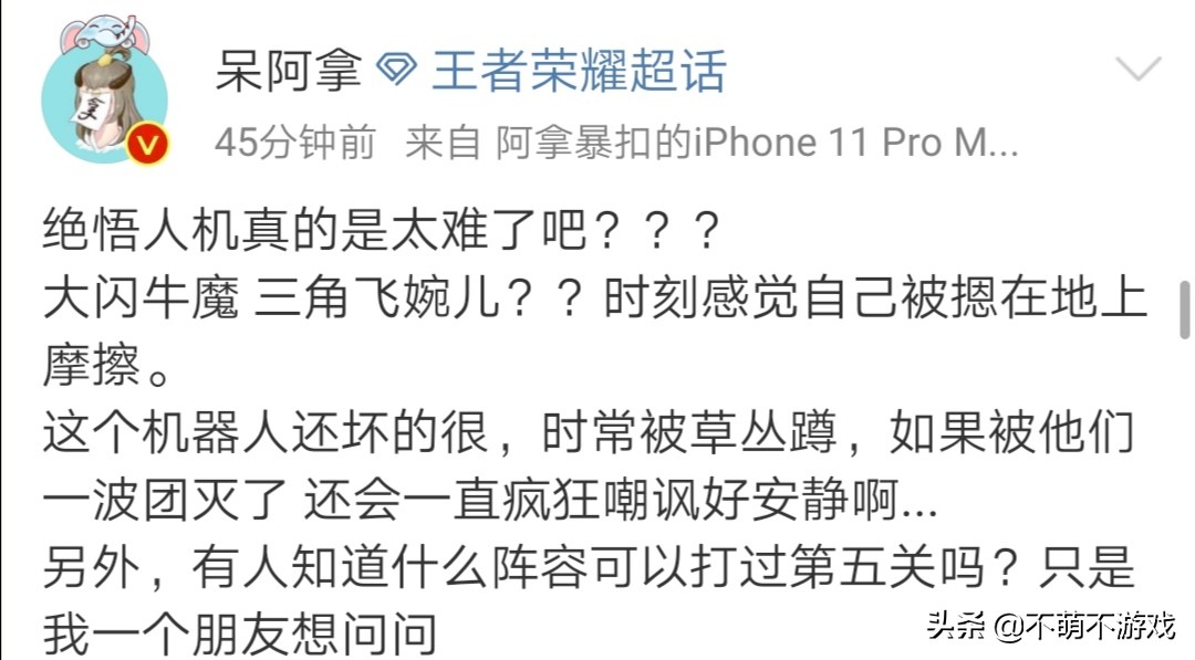 但是在玩的时候大家普遍反应,这个觉悟人机还真的比较强势,似乎是开了全图视野一样,只要玩家单走,就会遭到他们的围攻,不抱团根本无法胜利,并且他们的预判性还很强,能精准的掌握英雄和技能释放的距离,单挑的情况下,它们完美的操作几乎可以称作是无懈可击,与真实玩家的操作相比就是天衣无缝,而且只要自己接近他们,都能够提前预知并进行躲避,还经常碰到他们躲在草丛阴人的情况,牛魔大闪、婉儿三角飞运用的相当娴熟。
