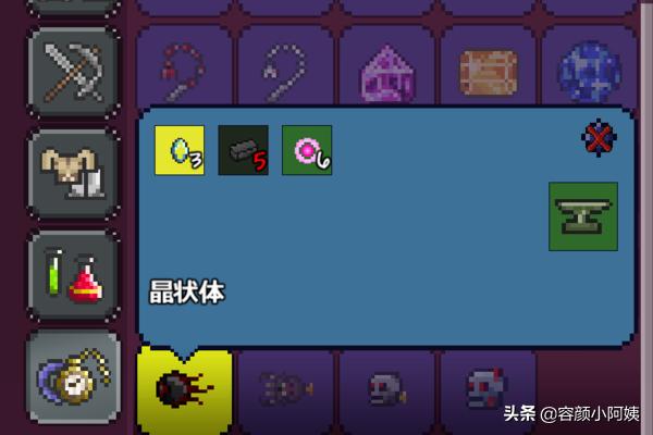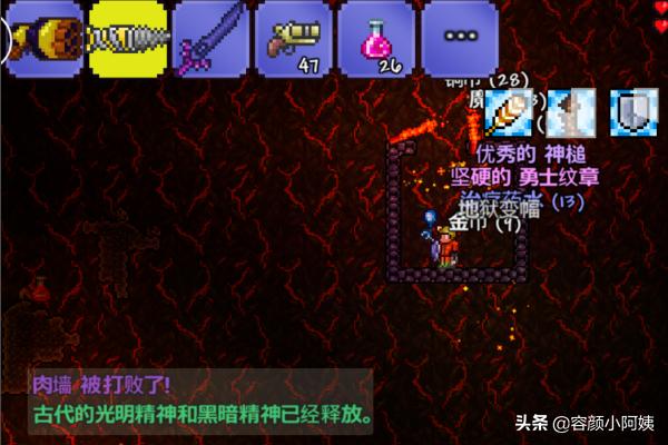 4、击败肉墙之后,整个游戏世界会发生变化,新增加敌人类型,矿石类型,也会获得后期世界的一些重要装备,比如神锤。