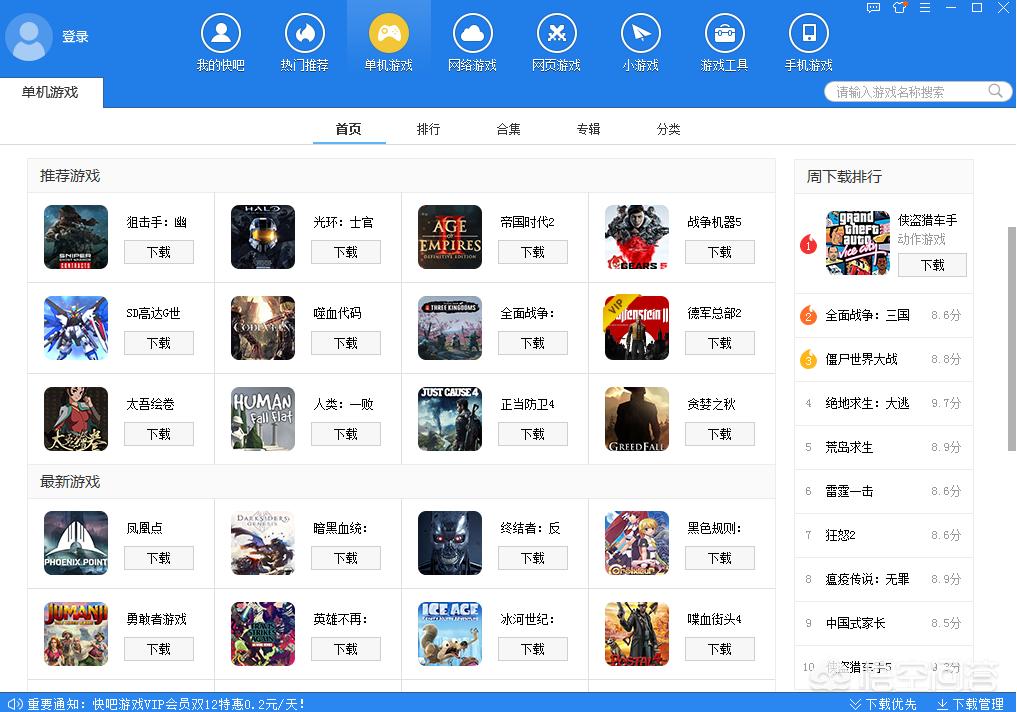 《快吧游戏盒子》是一款简单易用的游戏管理软件,提供了数千款热门的单机游戏,用户只需要点击下载,即可一键式安装运行,非常方便。同时游戏更新速度很快,新游戏上平台的速度也非常快,不过经常会被杀毒软件误杀,玩家需要自己注意。