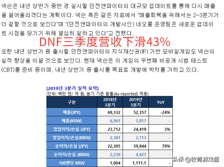 DNF母公司NEXON公布了第三个季度的销售额,同比下降了24%,其中中国地区DNF相比去年同期下滑了43%。这个数据想必跟其他第三方渠道统计的要准确一些,毕竟是NEXON直接公布的财报。看到这里你就发现,原来DNF真的下滑了这么多,这款游戏的状况其实已经不容乐观。