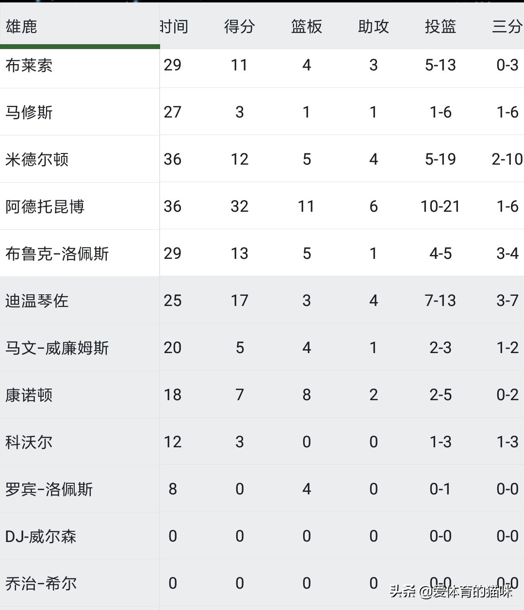 其实湖人今天的三分球投的并不好,只有32中6,命中率还不足两层,替补球员也没有什么亮眼的表现。反倒是雄鹿这边,迪文岑佐的表现让人眼前一亮,第正是他第三节的单节12分才使得球队比分没有被拉的太大,而且雄鹿这边除了字母哥以外4人得分上双,当然米德尔顿的手感确实不好,没有打出一个二当家应有的表现,除此之外雄鹿队没有打出自己擅长的攻守转换进攻。