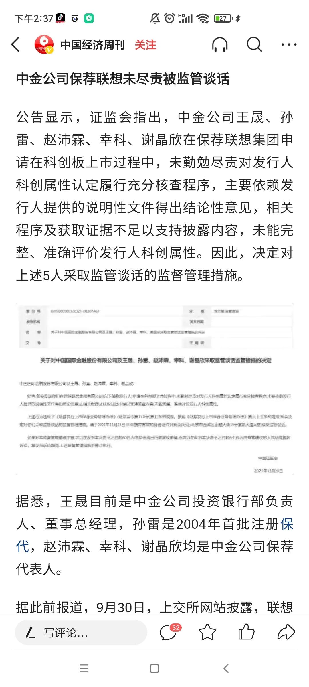 这个断言可能错了,看看吧,新华社旗下中国经济周刊:中金公司保荐联想未尽责被监管约谈。