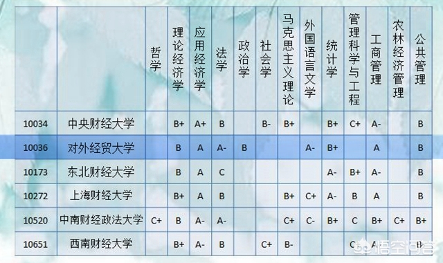 3:在教育部第四次学科评估中,对外经济贸易大学的应用经济学,工商管理被评为A类学科,法学,外国语言文学被评为A-学科,统计学被评为B+学科,理论经济学,政治学,公共管理被评为B类学科。