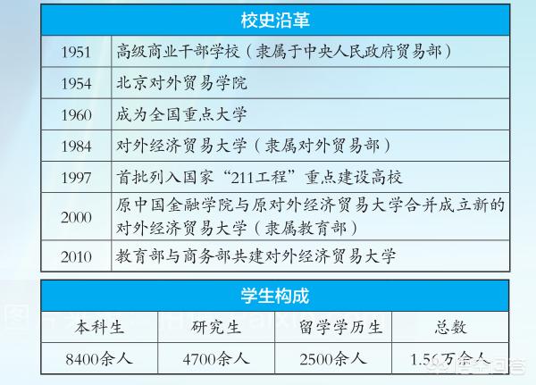 学校是“211工程”和首批“双一流”建设一流学科建设高校,教育部直属的全国重点大学。国际化、培养外语+财经复合型人才是贸大的两大特色。国际化体现在课程设置、师资队伍、合作交流办学上,教师有国际学术背景、双语教学、教材国际化等等都是贸大与众多财经大学之间的不同之处。