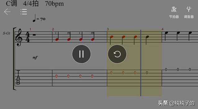 可以修改音符,给谱子做一定的调整,或者自己写歌能用到。初学者一般用的最多的是调整播放速度。画圈的位置可以调速,可以从网上下载的谱子,一般默认的都是显示第一个轨道,有的谱子会有很多个轨道,第一个显示的不是吉他的时候,可以在左下角这里调整,点击要显示的乐器轨道。