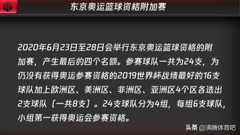 接下来中国男篮唯一获得东京奥运会资格的途径就是“附加赛”:于2020年6月23日~28日举行,一共24支球队参加(2019年没有获得东京奥运会资格的战绩最好的16支球队,再加上欧洲区、美洲区、非洲区、亚洲区各2支球队),分成4个小组,每个小组6支球队,获得小组第一的球队即可获得东京奥运会参赛资格!