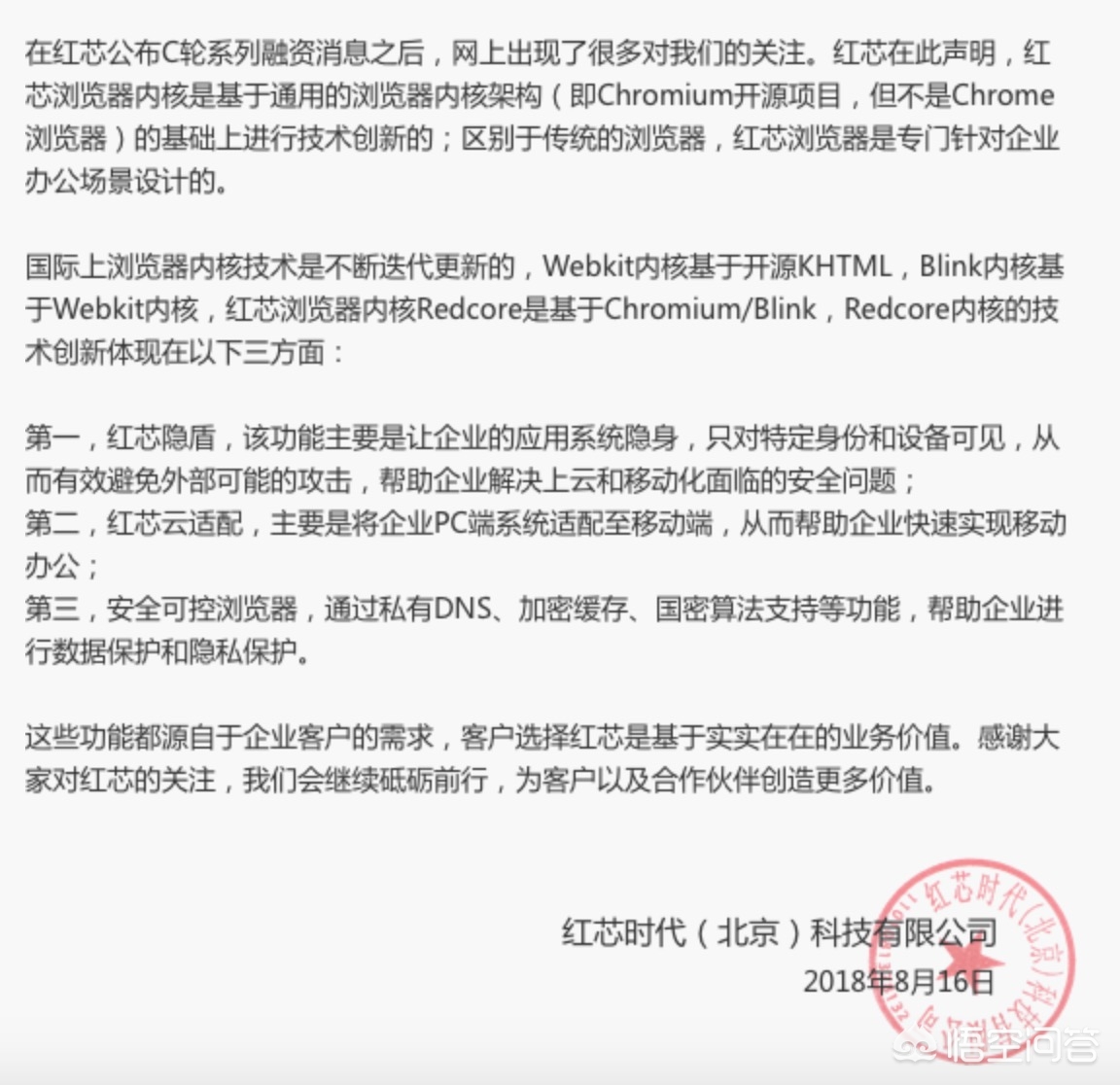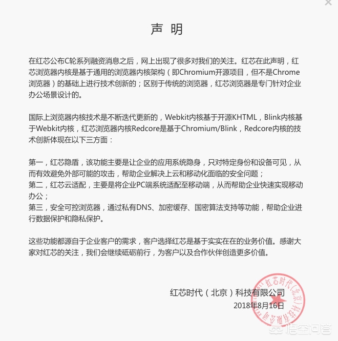 此外,现在打开红芯科技的网站,会弹出一份官方声明,这是昨天发布的,所以语气跟今天的道歉信完全不同,红芯科技还是在强调他们的红芯浏览器虽然用了Chromium的内核架构,但没有抄袭Chrome浏览器,并且有三大技术创新——红芯隐盾、红芯云适配以及安全可控。