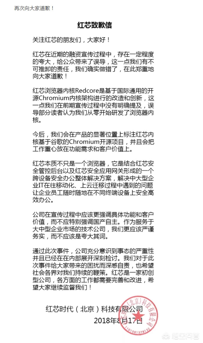 红芯时代(北京)科技有限公司今天在公众号上发表了《红芯致歉信》,表示红芯在近期的融资宣传过程中存在一定程度的夸大,给公众带来了误导,这一点上红芯有不可推卸的责任,他们承认做错了,在此向大家道歉。