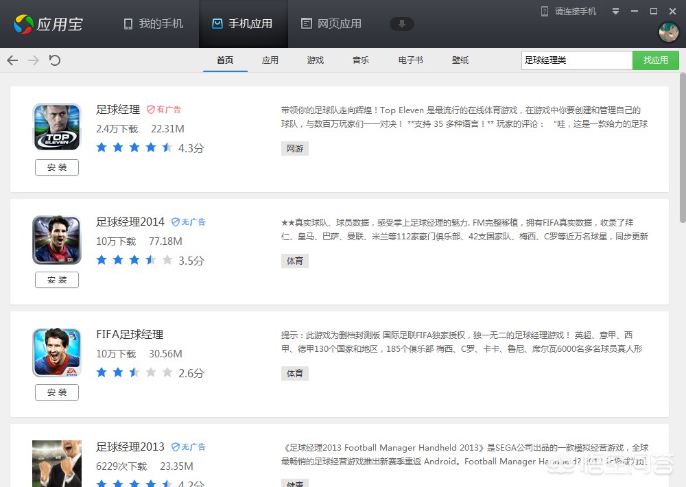 还有FIFA,杭商足球,在线足球经理等app可以从应用宝下载