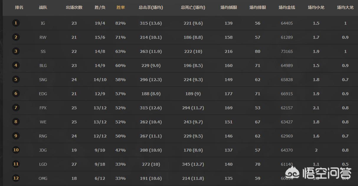 先总的来看一下所有战队的胜率排行榜,IG以82%居首位。