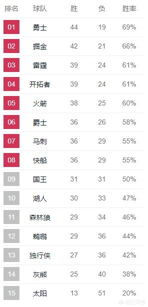 掘金1分惜败马刺,吃到了两连败,继续排名西部第二只不过落后第一的勇士达到了2场。雷霆、开拓者和火箭今天休战,排名3-5位。西部第六的爵士主场对阵弱旅鹈鹕,兰德尔大爆发30+8率领鹈鹕击败爵士,输球之后爵士依然排名西部第六,鹈鹕赢球排名上升一位来到了西部第十二。独行侠本场比赛完全不在状态,以39分不敌东部篮网,连续的输球让独行侠离季后赛越来越远,目前排名西部第13位。灰熊没有比赛,继续追赶独行侠。太阳虽然赢球,可是由于前期落后太多依然排在西部倒数第一位。