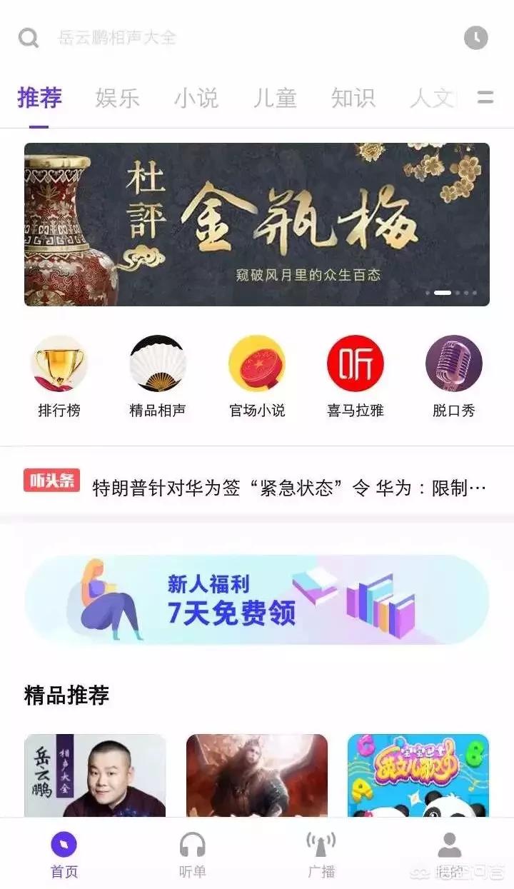 掌阅听书、免费小说听书、快听小说、听听FM、免费听书、天行听书(下载量过百万的);