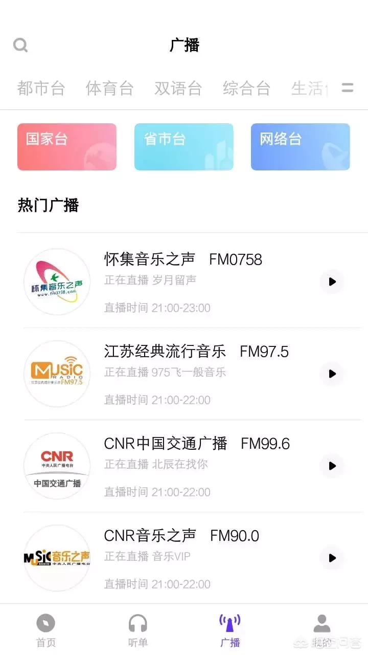 4、可以听广播,从资讯台、音乐台、交通台、经济台到都市、双语等等诸多分类都能够收听。