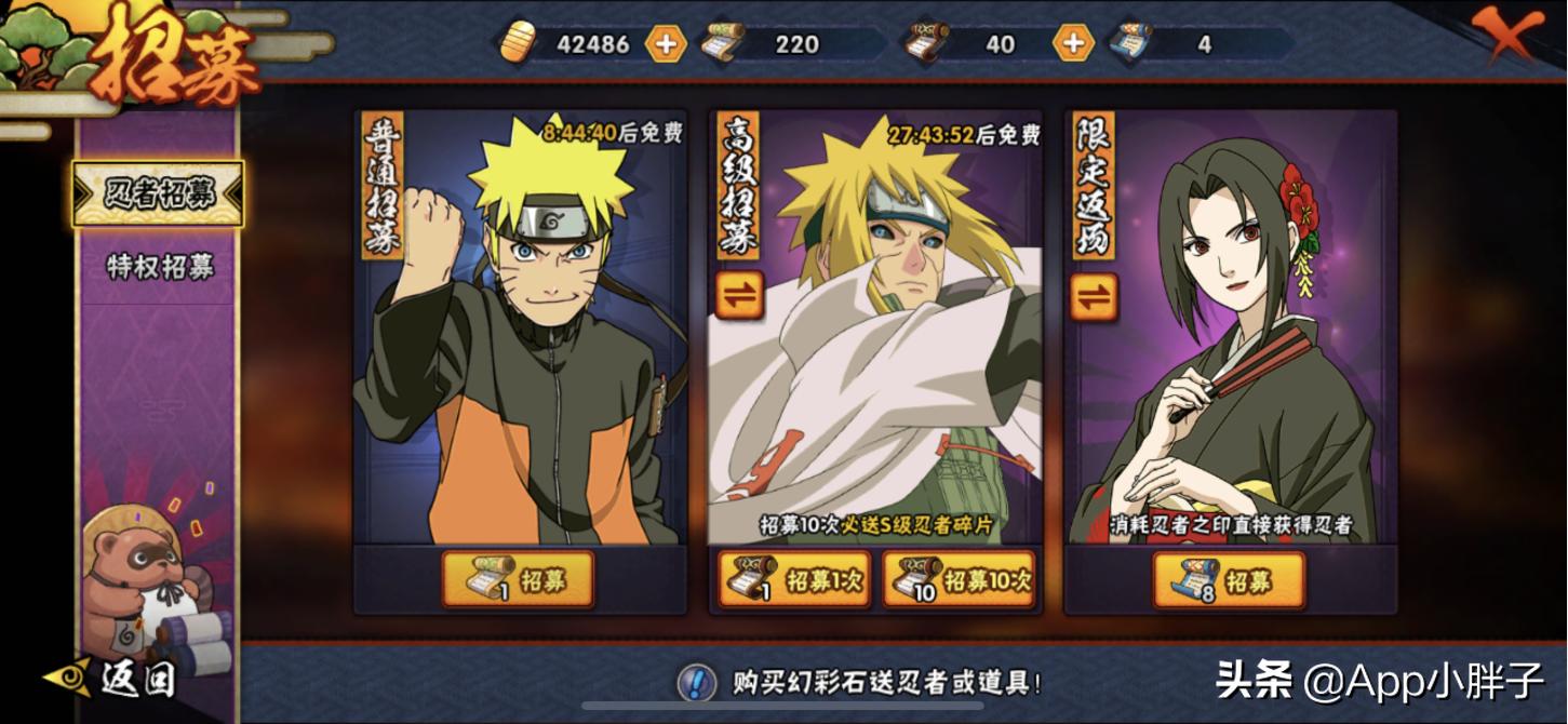 《火影忍者》手游:18000金币32高招卷,水门有10片是抽水门还是放弃抽初代