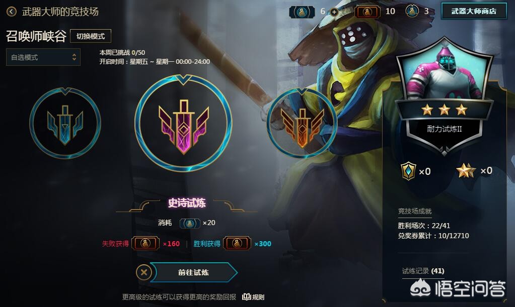 在武器大师竞技场中每个月可以领取20张免费的武器大师竞技场门票,门票可以进行不同等级的试炼,无论成败都会给一些兑奖券,而兑奖券可以在商店中抽奖,可以抽到皮肤,也能抽到一些你想不到的东西,偶尔还会掉落武器大师精致纹章,可以在商店中兑换限定皮肤