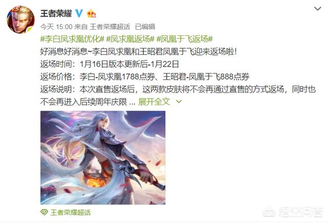本是在1月16日返场的李白凤求凰系列皮肤,因玩家吐槽活动时间安排不妥当而被官网延迟,延迟返场时间为3天到一周左右!