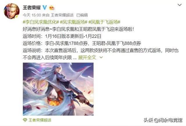 王者荣耀李白凤求凰系列皮肤延迟登场,只因玩家吐槽了一下,官网就采纳了建议,究竟是怎么回事?且来看看闲余电竞馆的详细介绍!