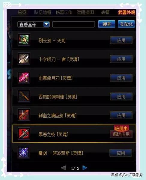 当然还有许多非常好看的武器比如罪恶之枝(但是我实在是欣赏不来),不过我认为武器幻化这个东西还是要看个人喜好的,比如我自己的两个鬼剑士都是幻化的流光星陨刀,便宜好看!