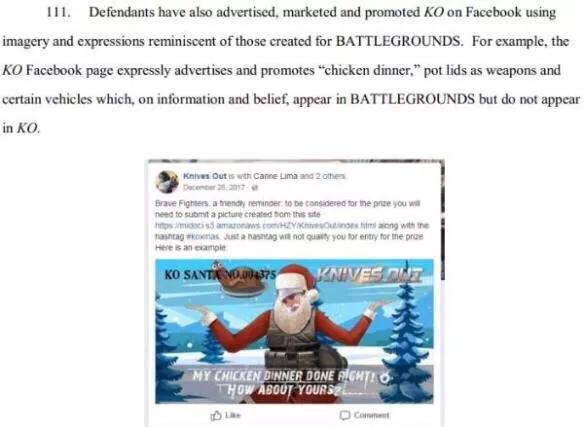 从起诉材料中来看,蓝洞说的并不道理。网易旗下的两款手游在宣传片都引用了《绝地求生》的标志性语言“大吉大利 晚上吃鸡”。