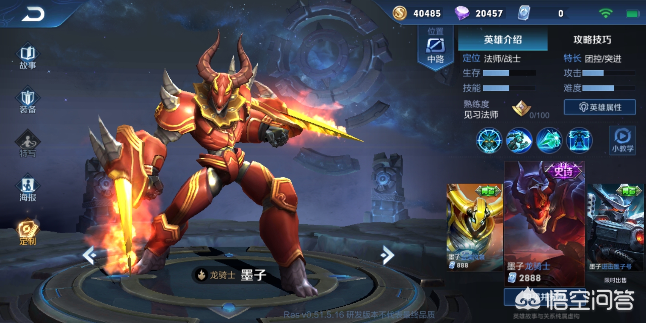 墨子的所有皮肤基本上都是只有颜色和形象有所差异,其他的什么语音、动画、特效等等都没有什么大变化。像6元皮肤和伴生皮肤也没啥说的了,但是金属风暴和龙骑士的价格都不低,尤其是龙骑士这款皮肤,没啥特效还要2888点券,还是史诗级皮肤,但是相对鲁班的2888皮肤简直就是天壤之别。
