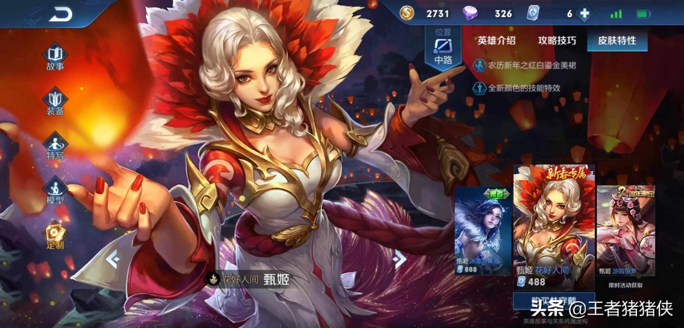如图,你可以看到,按照王者荣耀的惯例和习惯来说,勇者皮肤一般就是衣服改动一下,并没有实际的独特特效,并且在游戏中也没有技能特效改变,当然后边出的,有几款有改变,实属良心皮肤了,你可以看改动的这几个地方,还有甄姬的领子变更成白色的,完全符合勇者级别皮肤的特点,但是这个888点卷卖的实在是让人无法接受,我估计是官方当时想的为后续一些优化做准备,这个确实有很大可能,应为有优化了的皮肤非常漂亮的,估计官方是考虑后续,888点卷也有可能变成限定之类的。或者涨价那你先买的肯定是赚到了。