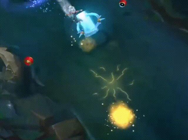 其次就是冰系(蓝色)了,这里虽说没有上图中风系那么大的范围,不过我们可以看到冰系主要是对敌方英雄造成控制效果。在宣传片中为了让大家觉得这个英雄厉害所以把杰斯给打死了,在实际的战斗中这一形态应该是用在留人上。