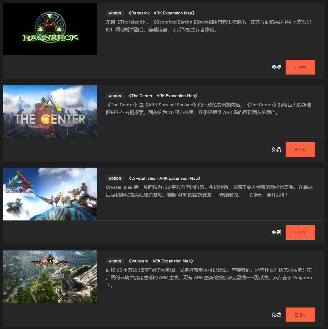 下面四个是地图的扩展包,都是用于打开方舟特定区域的内容,这些地图都是永久免费的,也包含了特定新品种的龙,随时可以领取,而方舟本体则是限时免费的。