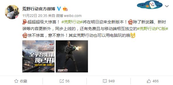 腾讯宣布和蓝洞合作的当天网上,网易的荒野行动官方微博宣布23号更新手游,同是24号正式上线PC端的荒野行动。