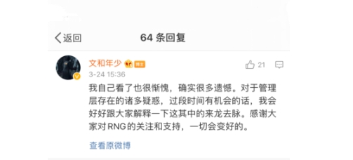 有趣的是,在LPL官博发了这段内容后,RNG的副总裁也发了一段很有深意的微博,有网友猜测是跟JKL有关,副总裁要挟管理层签下JKL。说实在的,JKL能不能去RNG,取决于Uzi何时退役,虽然Uzi只跟RNG签了三个月,但Uzi曾在直播中说过,今年是不会退役的。既然Uzi不会退役,RNG会签下JKL吗?个人觉得不会,一是因为RNG不需要JKL,二是JKL未必愿意来RNG,就算来了,Uzi不退役,JKL永远是第二选择。