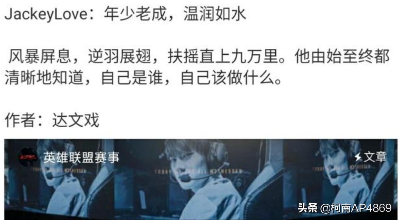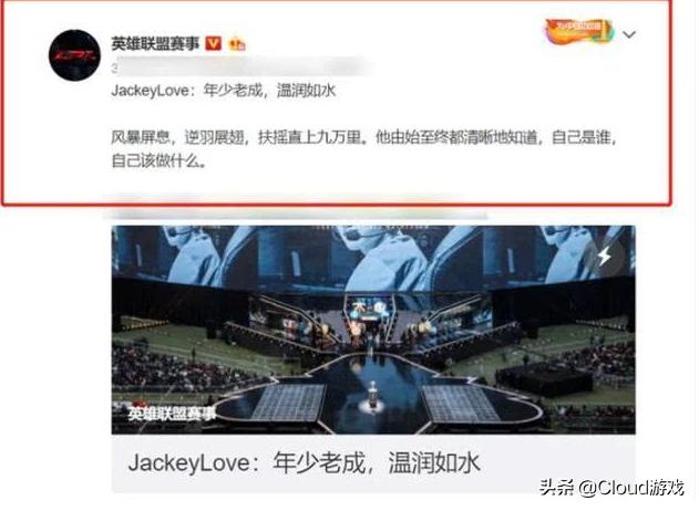前言:相信关注LPL赛事的小伙伴,都注意到LOL赛事官博转发了一则有关于Jackeylove选手的文章,文章中对于Jackeylove传奇的经历进行了概括,华丽的词藻和壮阔的语句让许多粉丝们心血澎湃,随后网络上关于Jackeylove回归的呼声也越来越大,于是便有人猜想,官博这个操作是否在为阿水的重新出山造势或者预热?这篇文章涛咪就跟大家来谈谈阿水最近的动向。