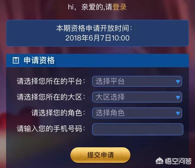 第二步 找到资格申请专项 依次填写账号 大区 角色 和手机号。填写详细后 点击提交申请。一定要填自己用的手机号 因为官方会发给你短信 告诉你申请成功。