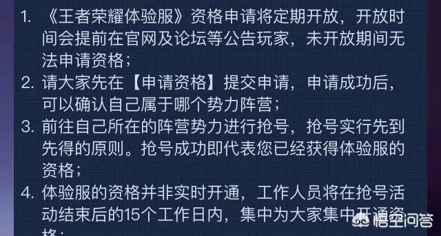 体验服顾名思义就是体验的服务器,和正式服是独立分开的。目前体验服只能安卓手机申请和下载试玩。体验服申请资格一般会在论坛和王者荣耀助手上公布,建议每天去王者荣耀助手里的官方专栏看开放申请的时间,一般都是提前3天左右发布申请日期。申请日期的10点去官网体验服论坛有链接,登陆qq或者微信申请,申请时间是10点-15点,申请后会告诉你成功没有,如果成功了请在15点的时候在嗨链接抢号,前10分钟很容易抢到的,5个阵营换着抢,抢到就会提示你15天之内给你资格,就可以下载体验服客户端体验了。(长时间没有登陆体验服会降低信誉积分,过低会被回收,以后也不能申请了!)