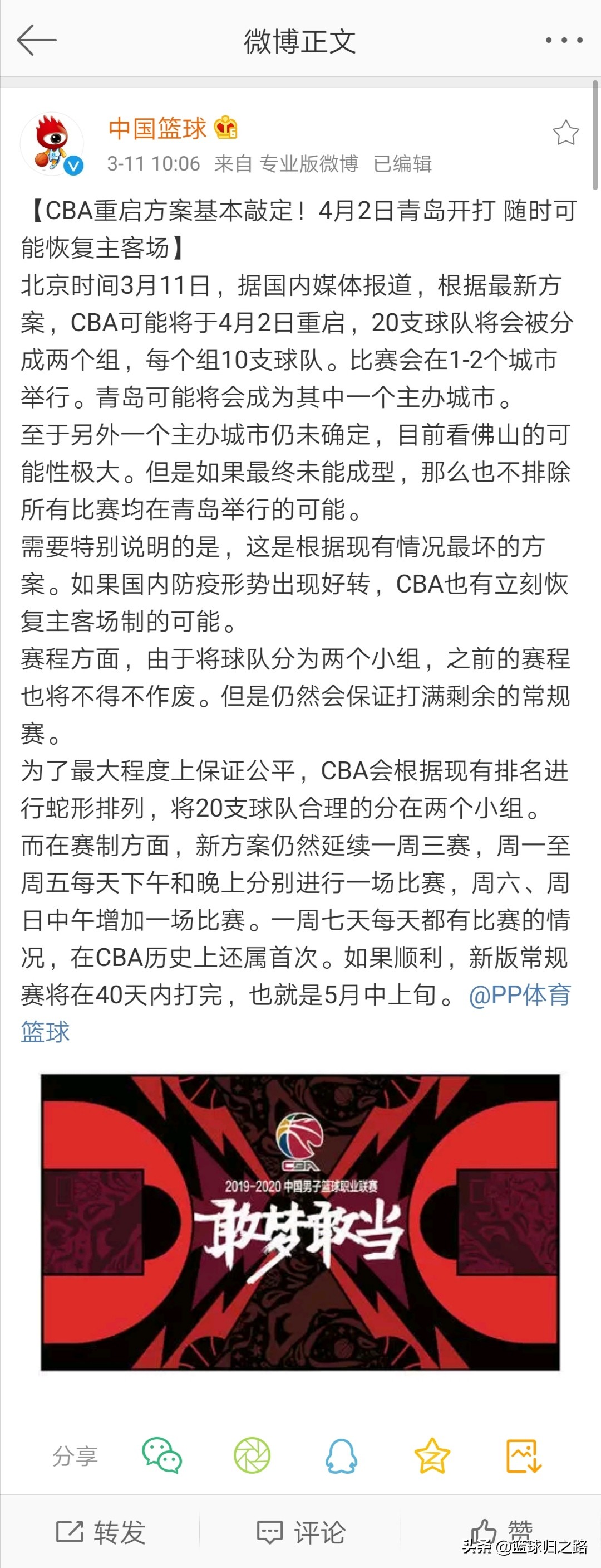 CBA据国内篮球记者透露,CBA联盟明确告知各队联赛预计4月重启,最早4月2日开赛。 此前媒体传言会采用赛会制,青岛和佛山有望举办。不过,目前还没有最终方案。但是不管怎么样,CBA的重启计划已经启动,也彰显了CBA的决心,希望在现实条件下做出最好的安排,不管是“空场比赛”还是“赛会制”,也希望通过直播,保持比赛的观赏效果。在保证安全的情况下,尽可能减少疫情对行业的影响。