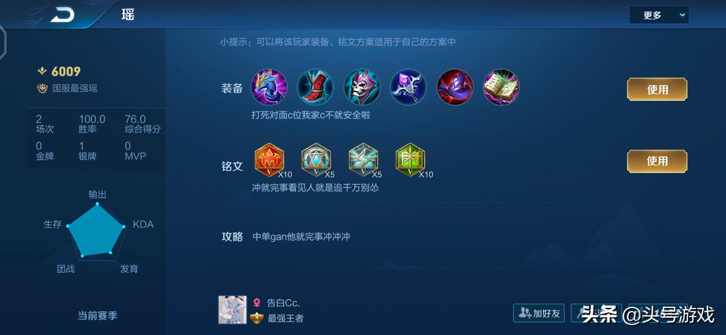 在这里不得不说,一个英雄确实不一定局限于常规打法,能打国服的英雄,玩家多多少少有自己的心得。就像这个瑶,如果不给你们看战绩说出来你们会信吗。不过可惜的是,我们只能在战绩中看到他的出装情况,至于具体的铭文我们却不得而知,这位玩家也并没有透露。不过没关系,如果是走中路当法师,我们就带一个常规的法师铭文,即使差也差不了多少,也许我们也可以试试,用中单瑶上波分。