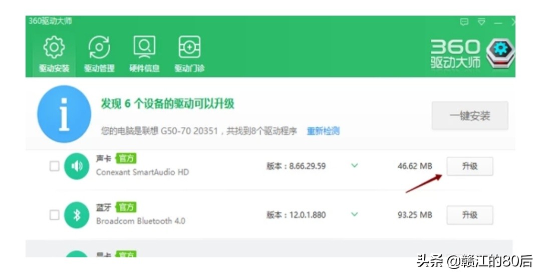 3、检测完毕后,我们可以看到我们的声卡驱动需要安装或升级,点击安装或升级,就会开始自动安装或升级声卡了。(下图3)