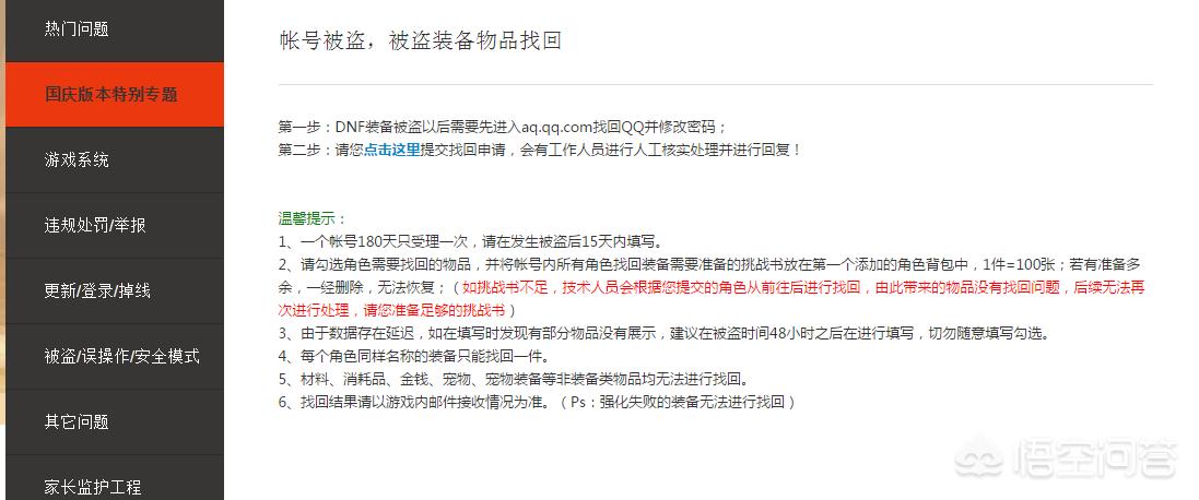 题主还算是幸运的,因为装备被盗或者被失误弄丢,还是有方法找回的。方法如下:搜索DNF官网,然后进入官网找到官网上方‘游戏安全’列中的被盗找回。然后点击该界面中的‘点击这里’进行申请,根据网页提示输入相关信息即可。