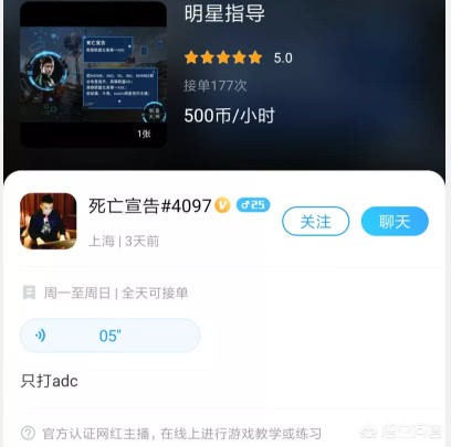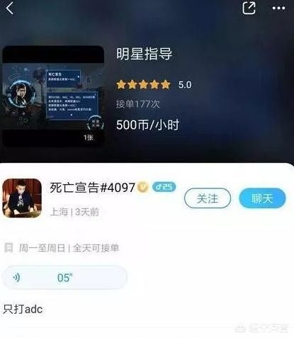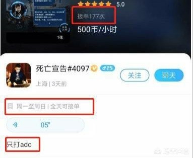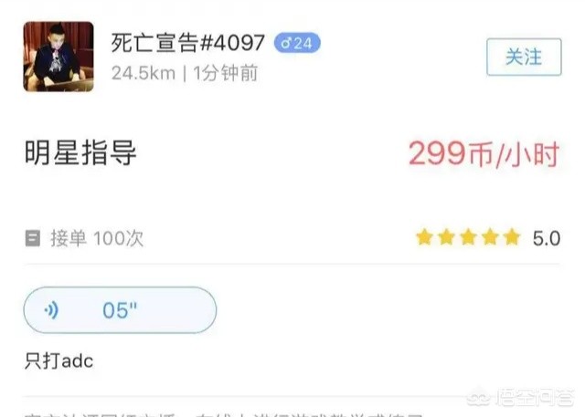 近日,有网友发现,死亡宣告已经放弃直播转行做陪玩了,而且价钱还不便宜,一小时要500元,备注只有一个要求,只打ADC。死亡宣告打职业那会就是ADC,做陪玩自然要打最擅长的位子了。价钱虽然贵了点,但实力有保证,目前已经接了177单了。