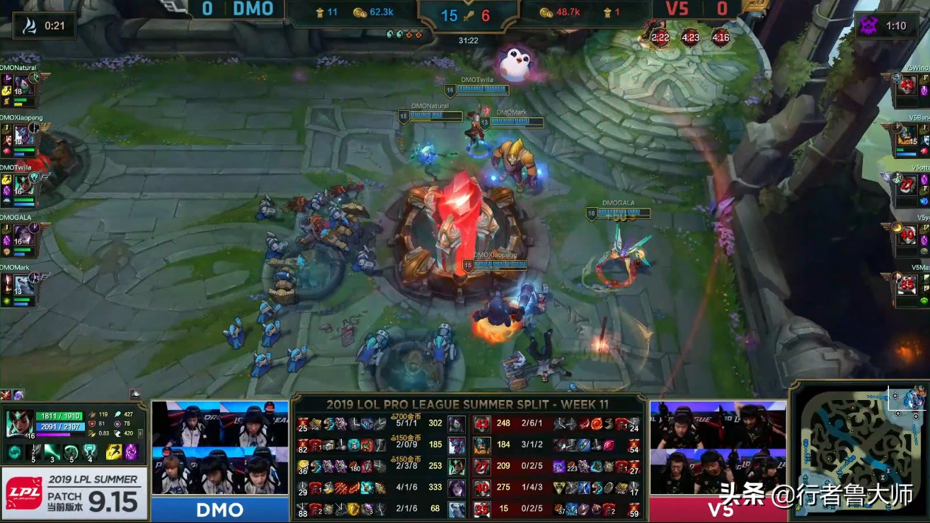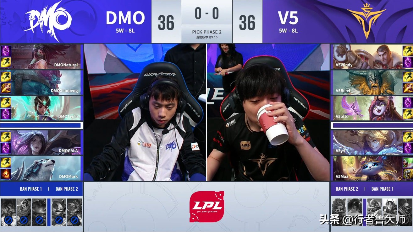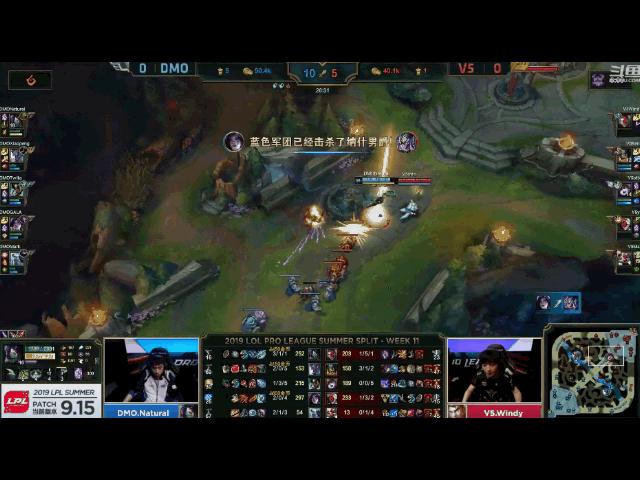 在随后进入地图资源互换的阶段,先是DMO阿卡丽上路想要完成单杀,却被V5众人反蹲成功,但是DMO依旧拿到下路一塔以及第一条水龙,并且随后DMO中野辅成功联动,中路强行击杀杰斯后,三人再次拆掉V5中路一塔。此后V5虽然又组织起多次反扑,但是DMO依旧抓住机会拿到上路一塔,以及第二条水龙,场面上DMO占据一定优势。