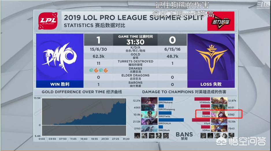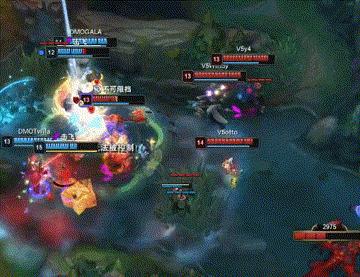 在连续破掉V5中上两路高地之后,DMO再次选择先手开团,辅助狗熊先手将otto的璐璐背回开团,双方经过一番拉扯后璐璐率先阵亡,DMO众人抓住V5选手回家补给的时间,直接强行拔掉两座门牙塔,一旁的卡莎也是伤害拉满,最终DMO轻松击败V5拿下首盘胜利。