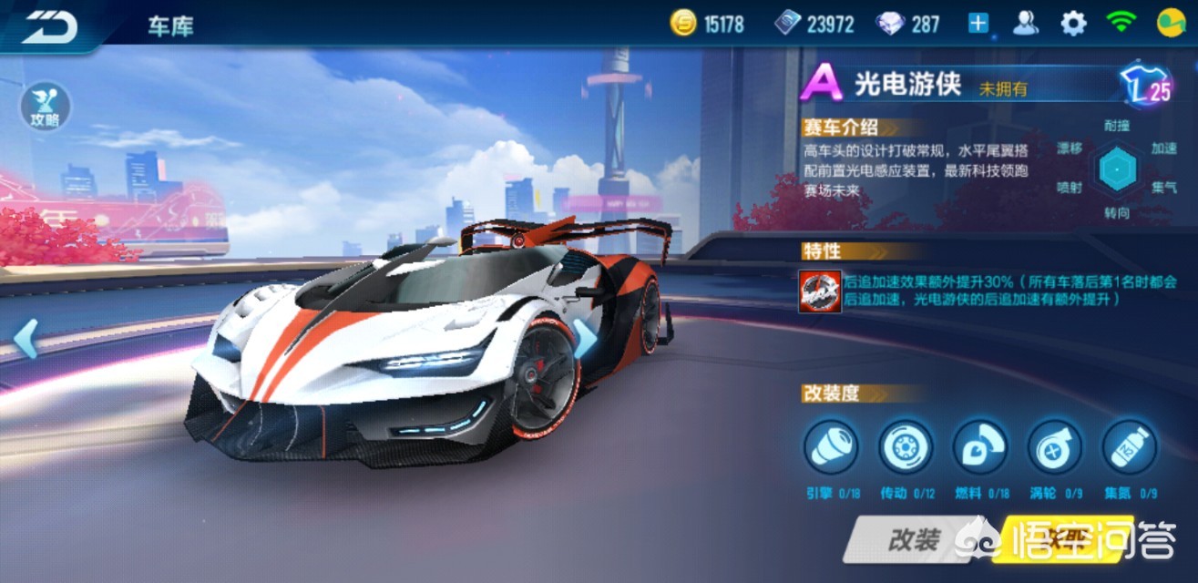 A车光电游侠,相信大家也见识过,在出狗车时的一个活动,充200送30天的光电游侠,小编也玩个这A车,自我感觉还是可以的,特性是后加速,只要不是第一名,这特性速度最高可以加到330左右,偷鸡开这车相当不错。