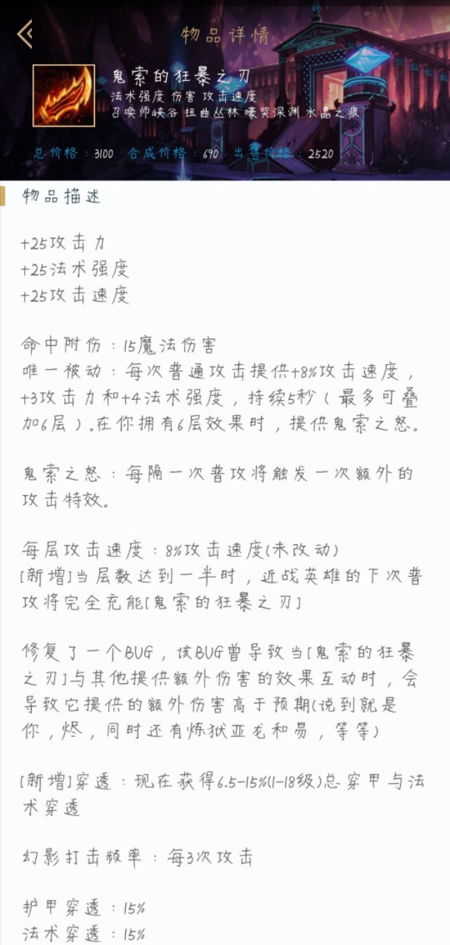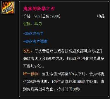 旧版本羊刀主动效果:+30点攻击力,+40点法术强度,并且每一次的普攻都可以叠加攻速与攻击力,还有额外的法术伤害,层数满了之后会提供鬼索之怒!!你知道那个版本的羊刀效果有多厉害吗?叠满之后平A出来的效果跟你买了个提亚马特似的,小范围伤害,而不是单一伤害了,对于武器大师来说简直就是一个不会被封的BUG了,曾经那个峡谷,出了羊刀的武器大师是公认的BUG,第一件就是羊刀,把你打的一刀都不敢补!