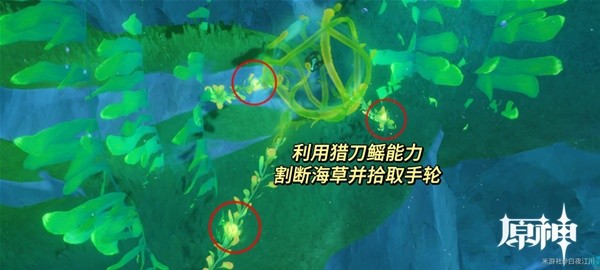 这里管道上的手轮被附近的海草困住了,我们需要吸收旁边异色猎刀鳐的能力,并割断海草,取出手轮。
