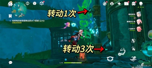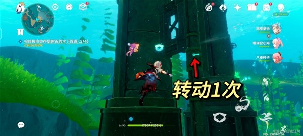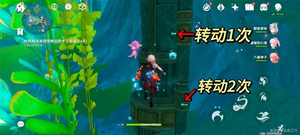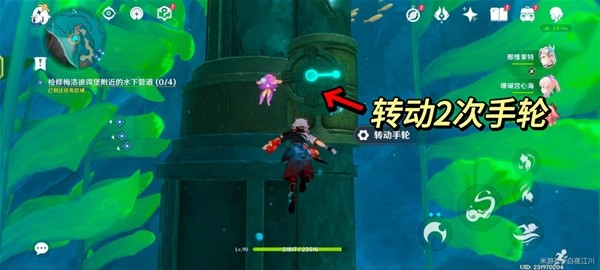 解决红恶棍后游到管道旁,转动上方手轮1次,下方手轮3次,即可止住气体外泄。