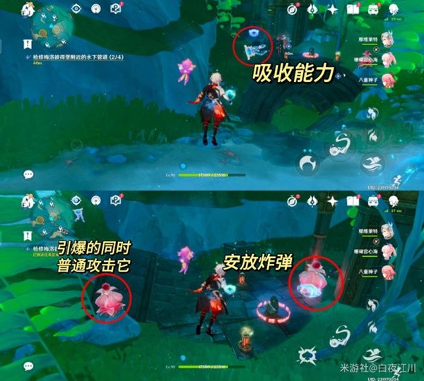 首先,吸收附近异色水母的能力。接着在其中一个红恶棍旁边安放上炸弹,然后游到另一个红恶棍处。最后引爆炸弹并在引爆的同时普通攻击面前的红恶棍。